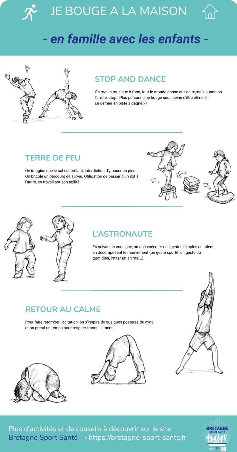 En intérieur comme en extérieur, il est capital que les enfants bougent et se dépensent tous les jours. L’OMS recommande au moins une heure d’activité physique quotidienne pour les enfants : pas toujours facile à atteindre, surtout quand les sorties sont limitées ! Les infographies proposées par Bretagne Sport Santé vous proposent des idées d’activités simples pour faire bouger vos enfants… et bouger avec eux !