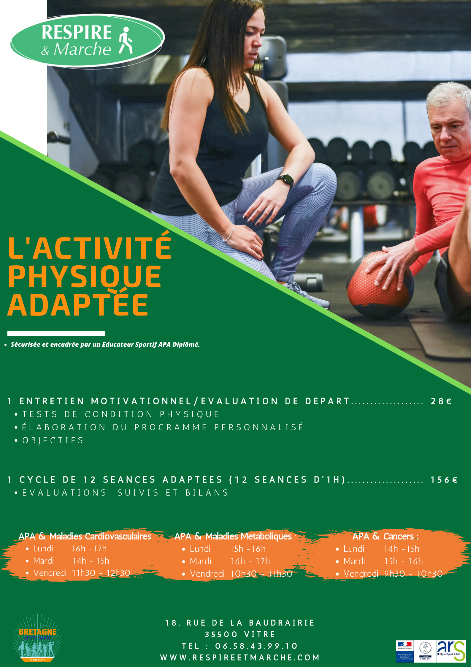 Programme d’Activités Physiques Adaptées pour les personnes souffrant d’une maladie chronique ou une affection longue durée. L’objectif est d’accompagner les traitements, d’améliorer le confort de vie au quotidien. Les séances d’activités physiques adaptées sont encadrées par un professionnel diplômé, sécurisées, progressives et s’inscrivent sur des cycles de 12 séances d’une heure. Des cycles sur mesure, des exercices adaptés aux capacités et objectifs du patient.
