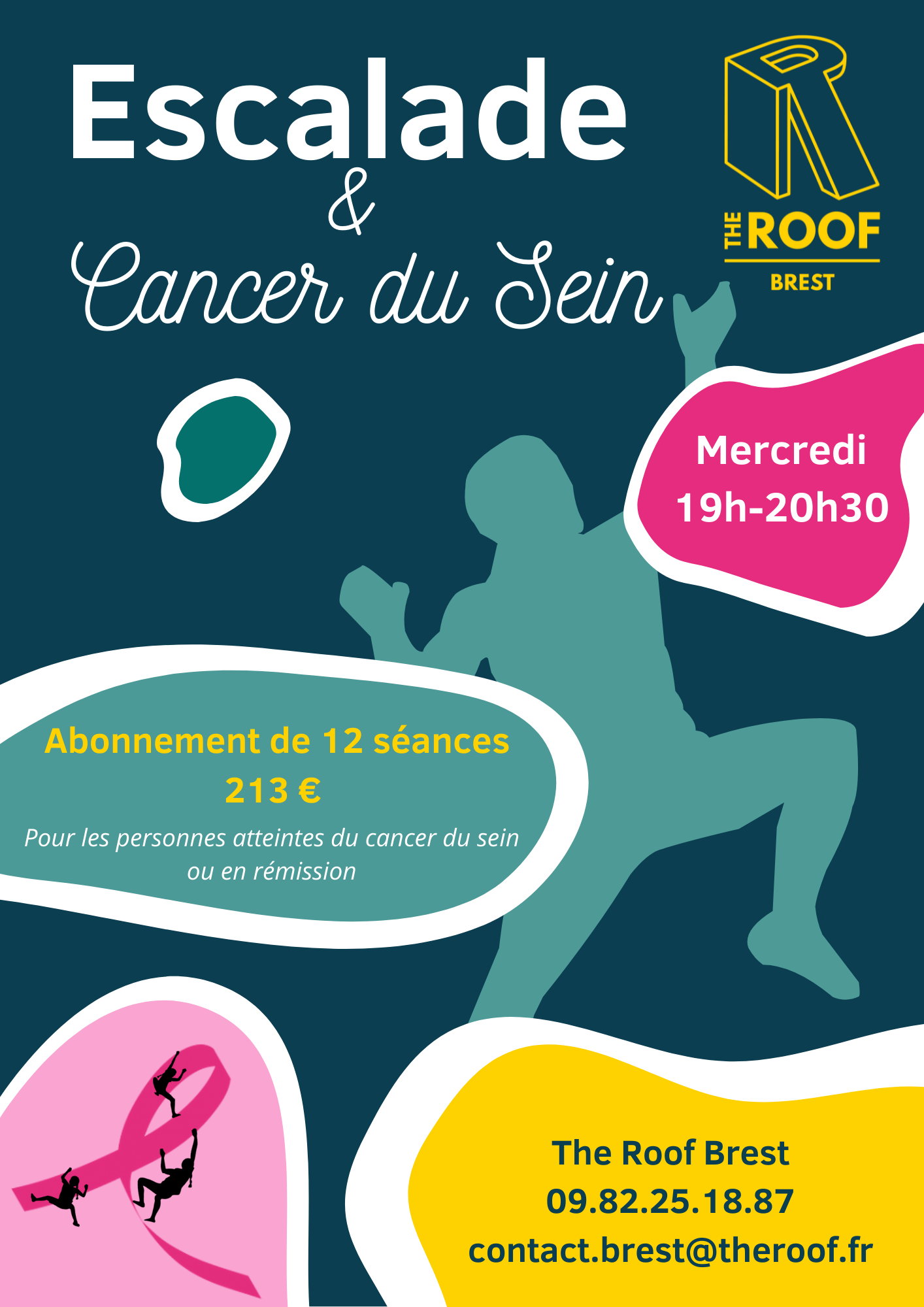 Les cours sont encadrés par un moniteur spécialisé dans l’escalade et le cancer du sein et en partenariat avec une kinésithérapeute D.E. Spécialisé également.