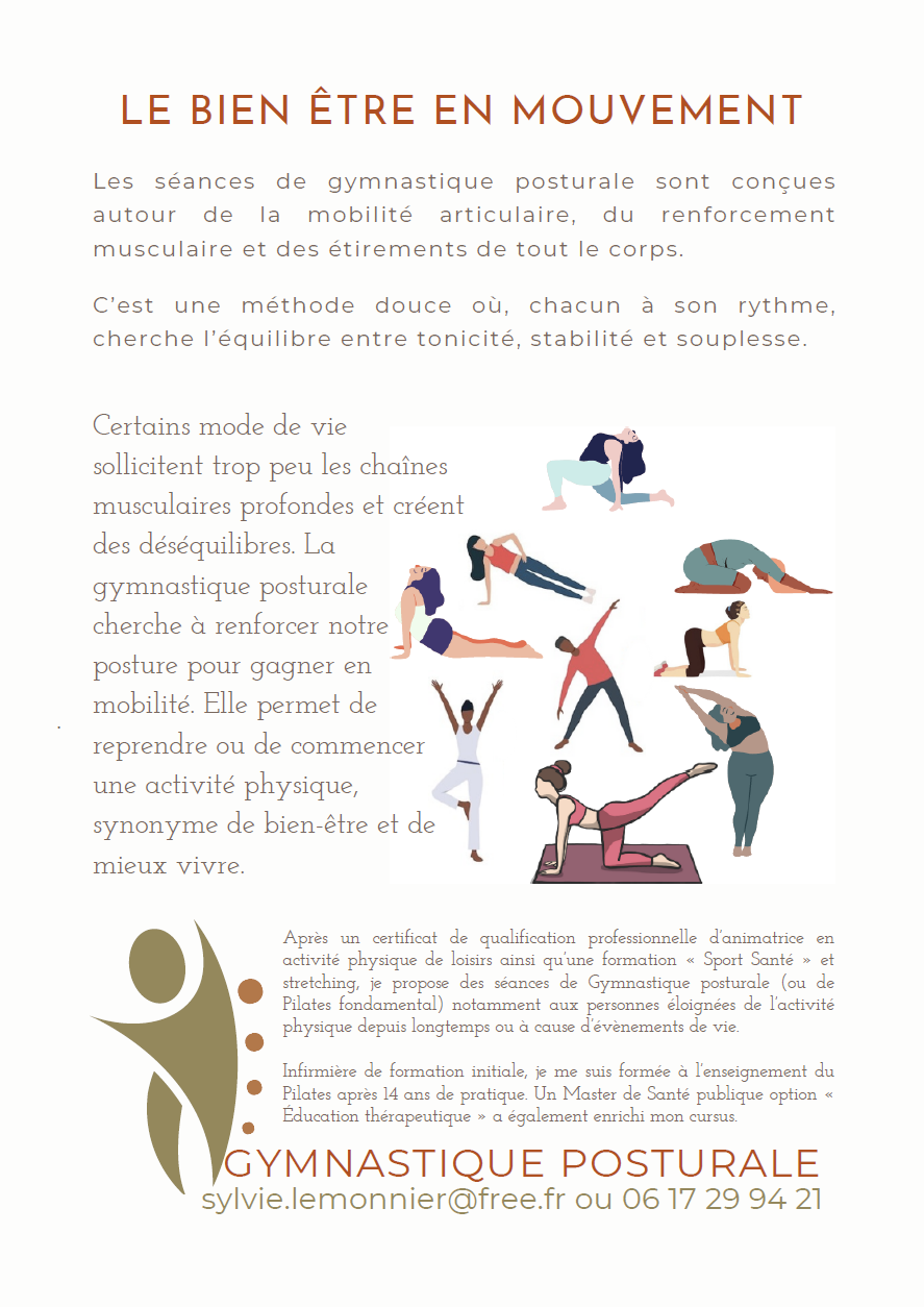 Les séances de gymnastique posturale sont conçues autour de la mobilité articulaire, du renforcement musculaire et des étirements de tout le corps.